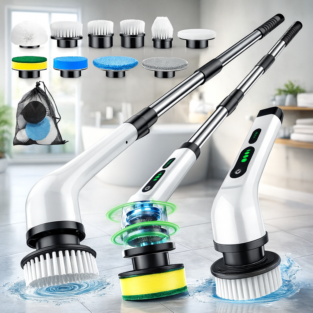 Moćni bežični čistač sa rotirajućom glavom i 7 nastavaka skida kamenac, masnoću i prljavštinu — bez napora i bez saginjanja.